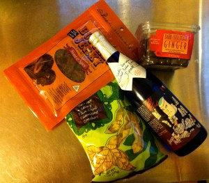 The Sake was served chilled and was a clean, slightly fruity junmai with finishing notes of warming alcohol and rice. For my three snacks I chose: Sweet and Spicy Buffalo Jerky, Savory Mini Edamame Rice Crackers and Dark Chocolate Covered Ginger. Here is how everything went together: