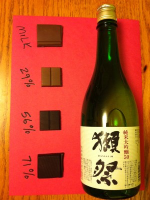 Pairing Sake with chocolate is not a common practice but as we have seen in the past Sake’s versatility and complexity make it a perfect pair with a wide range of foods. I struggled with an idea that would be entertaining to readers but also present information that they could use. When pairing foods with alcohol, rarely is there a “bad” pairing but there are pairings that go outside the scope of what one is trying to accomplish. To delve into the idea of Sake with chocolate, we will look at one Sake paired with chocolates of varying cacao content. The stronger the cacao percentage, the earthier and more robust the chocolates become; their interaction with the Sake varying as well.