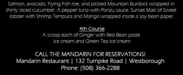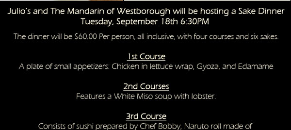 The latest Sake and food pairing attempt in the Boston area is…well, not in the Boston area. Julio’s Liquors is teaming up with The Mandarin, a local Chinese/Japanese restaurant, to bring you four courses and six Sake on September 18th. The event is sure to be a crowd pleasing one with Asian fusion food from the Mandarin and some great Sake and knowledge from Massachusetts’ best liquor store.